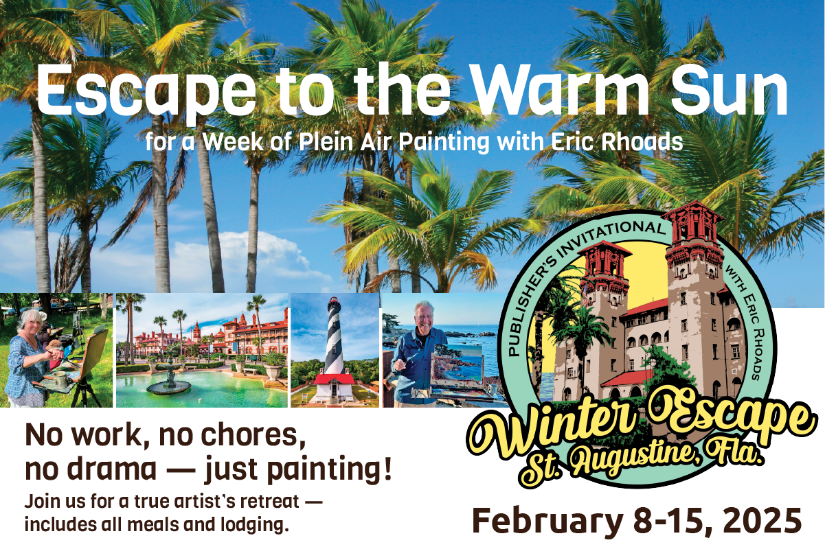 This February, join me in sunny St. Augustine, Florida, for my newest art retreat, the Winter Escape. It’s a weeklong retreat for plein air painters like you and me, designed to take you away from the ice, the snow, and the gray skies and give you a week of warmth, sunshine, and painting.