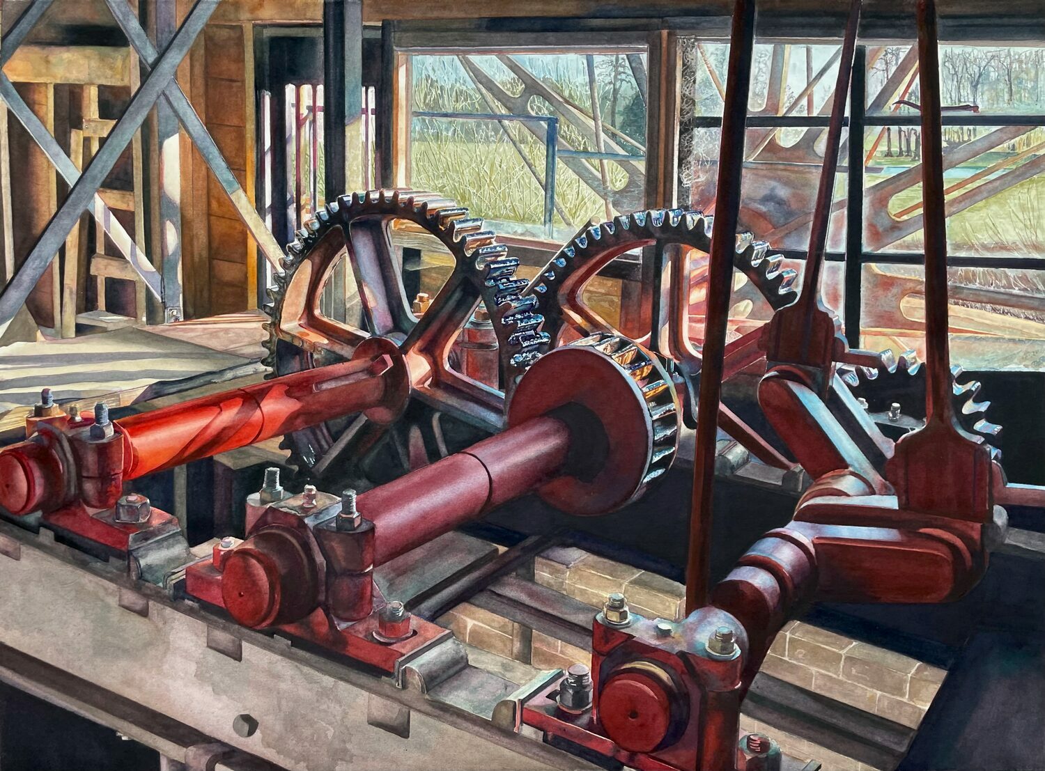 “For me, the main attractions of this waterwheel are the complicated gears, mechanisms, and heavy industrial demeanor,” says Tracy Love. “I also loved how the soft winter morning light behaved with the window, acting almost like a prism to enhance the cooler pinks and purples, while casting shadows across the mechanical shaft. I wanted the viewer to feel as though they were standing with me, looking through the hazy window and catching a glimpse of the Serpentine Lake beyond.”
