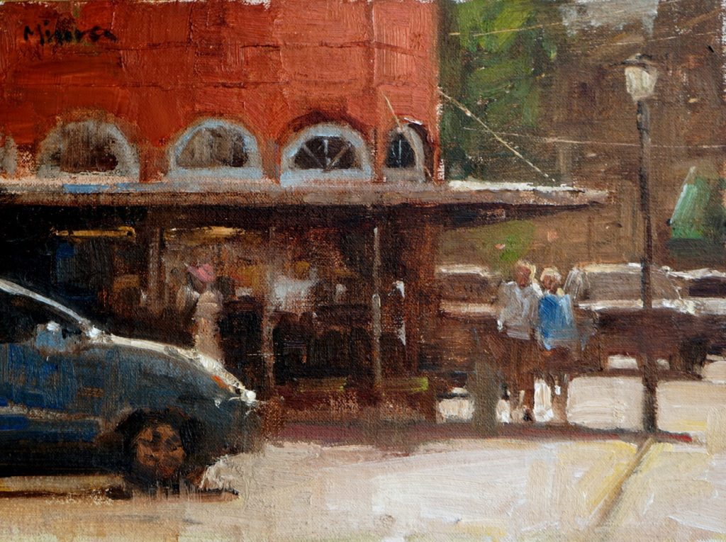 Terry Miura, “Corner at the Plaza,” oil on linen, 9 x 12 in.